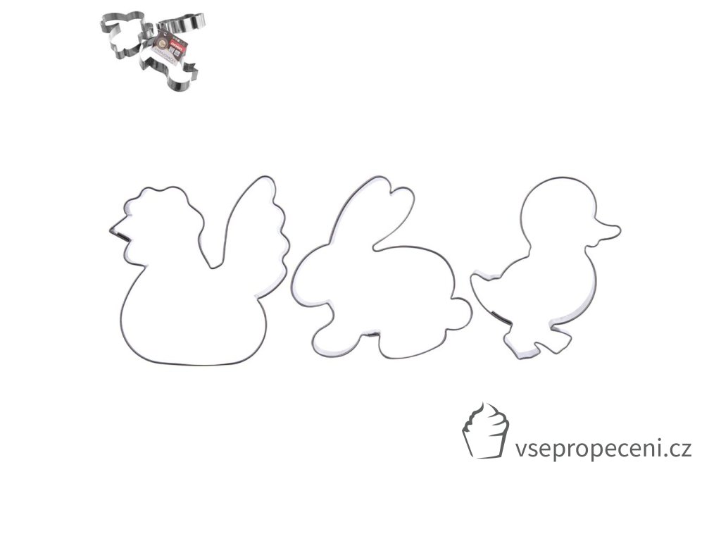 Vykrajovačky - velikonoční sada I - 3 ks - zajíc, slepice, kuře. Materiál: nerez. Rozměry: cca 6x5cm, v. 1,6 cm.
